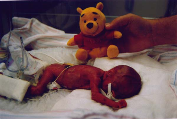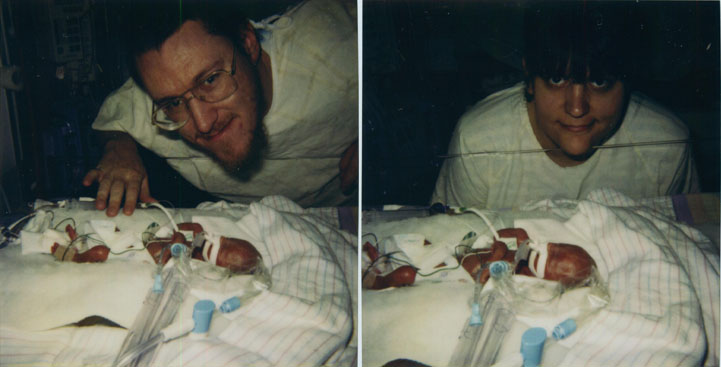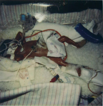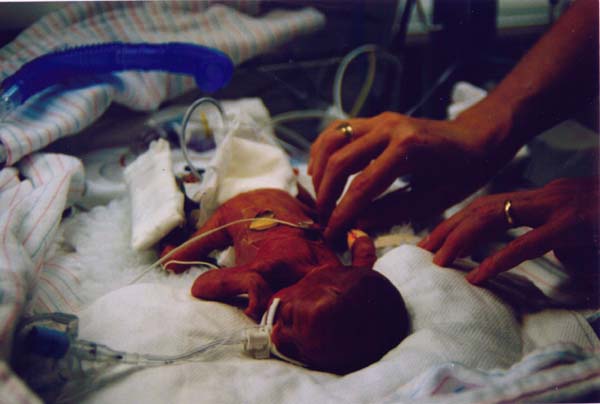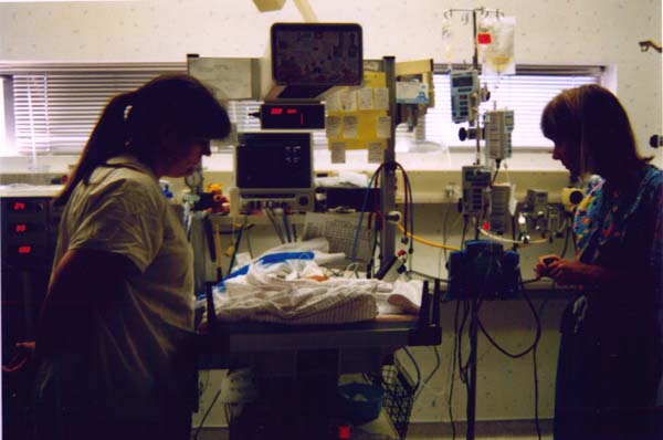 This is Keith's station and all of his equipment. The woman on the right is Keith's first nurse. She is an angel and I never would have gotten through the first few days without her. Keith would hold his hand curled up with his thumb between his first and second finger. We liked to joke that he was playing the "I've got your nose" game. Pround Momma |