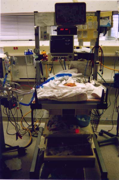 This is Keith's station and all of his equipment. The woman on the right is Keith's first nurse. She is an angel and I never would have gotten through the first few days without her. Keith would hold his hand curled up with his thumb between his first and second finger. We liked to joke that he was playing the "I've got your nose" game. Pround Momma |